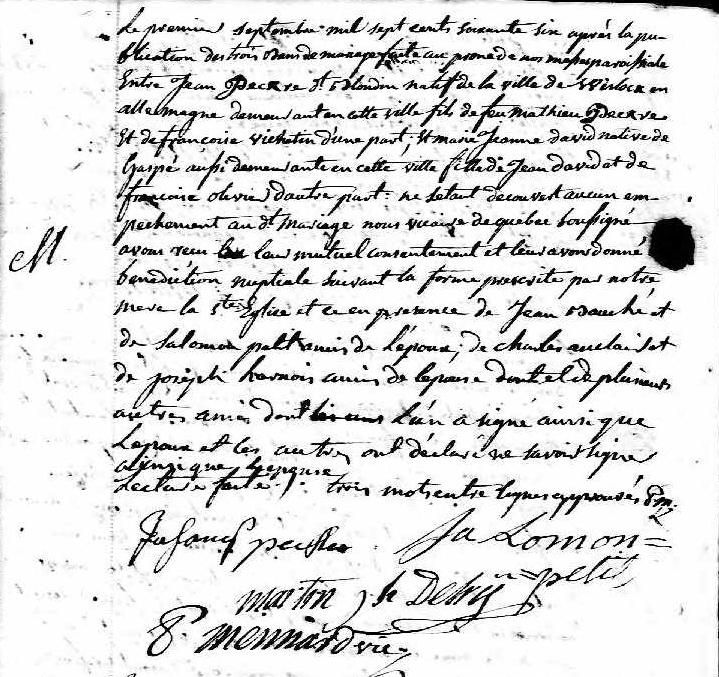 Almost fifty-one years earlier than this final record, is the first record of Johann Becker. It is the September 1, 1766 marriage acte for Johann Becker and Marie Jeanne David in the parish register of Notre Dame de Québec2. And it tells us a number of things.