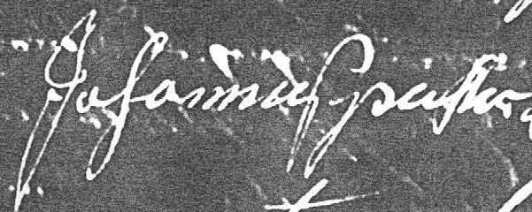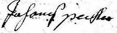 Third, consider his name. With four exceptions, his signature is "Johannes becker". In the First copy of his marriage record, he misspells his surname, as "Johannes pecker" and in the Second copy, he misspells both his given name and his surname, as "Johanes pecker". In the record for Baptism 2 (his daughter, Johanna), he misspells his surname, as "Johannes pecker". Finally, in one of the records for Baptism 7 (his daughter, Marie Angélique), he misspells his given name, as "Johanes becker".8